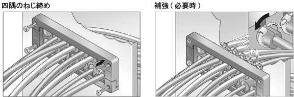 ケーブルマルチ引出板の四隅のねじを、下記の締め付けトルクで締め付けます。