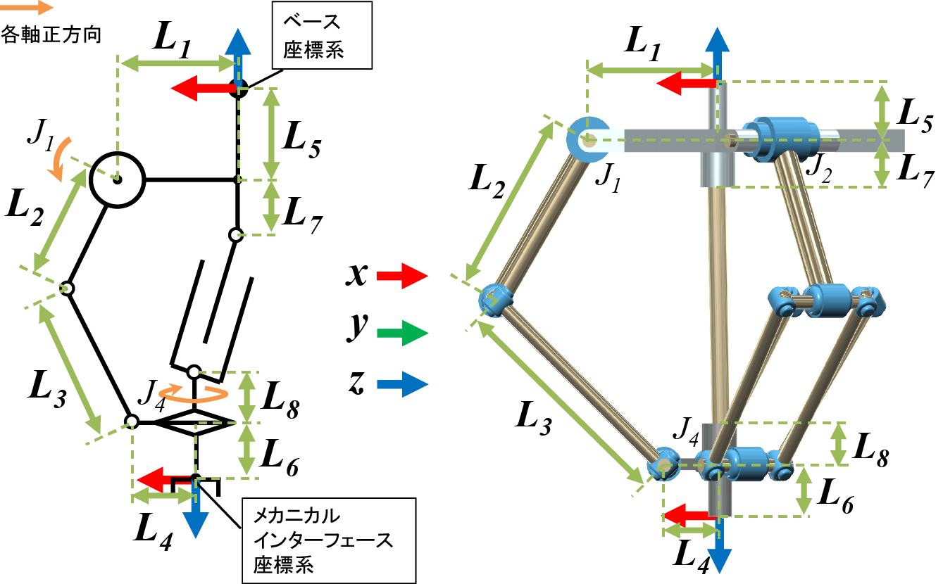 上記の3軸パラレルリンクロボットで設定する長さに加えて、L7とL8を入力します。(単位:mm)