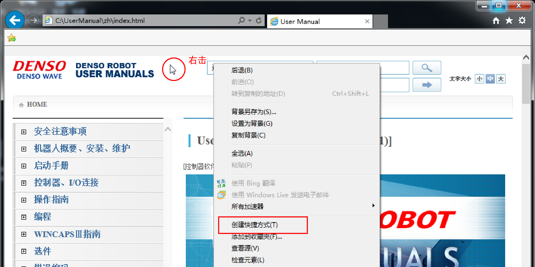 在桌面上创建本使用说明书的首页的快捷方式。