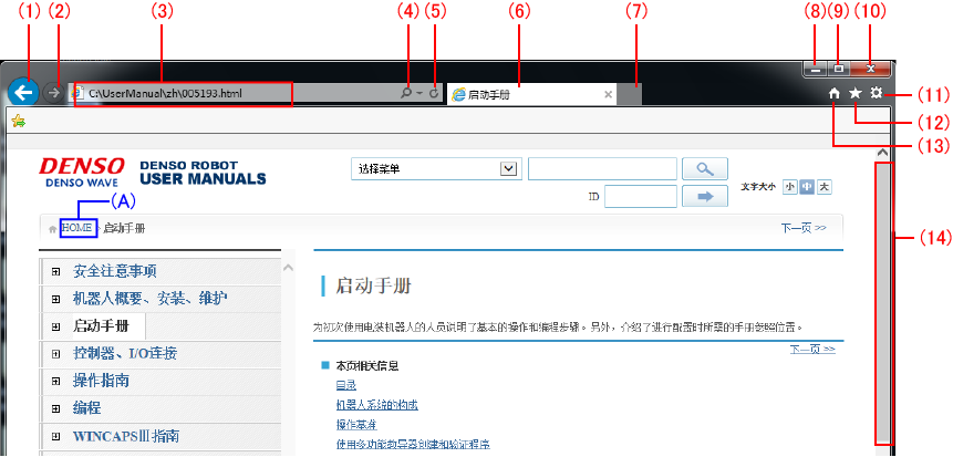 | (13) | 主页 | 移到浏览器的首页画面。 (A)的HOME移到完全使用手册盘的首页画面。 |