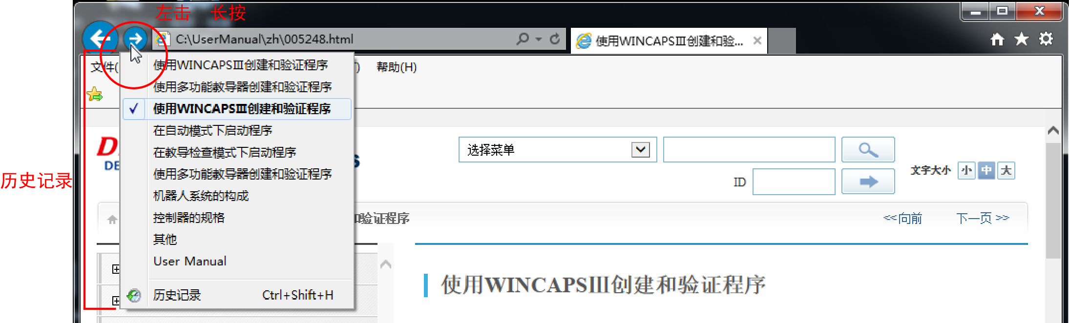 即使不一步一步地进行[返回]、[前进],也可显示以前查阅过的历史记录,直接打开该内容。