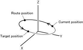 The robot moves to a route position and then a target position along an arc drawn over 3 points: current position, route position and target position.