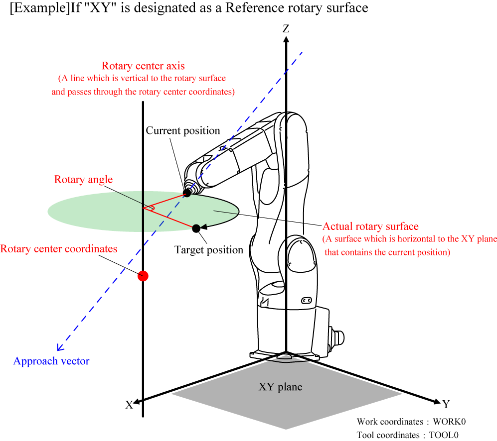 - Specify a plane which is a base of the actual rotary surface where a robot passes through when actually operating.Use any of "XY","YZ","ZX","XYH","YZH","ZXH",(矢量型, 矢量型, 矢量型) for designation. Refer to "Designating reference rotary surface".