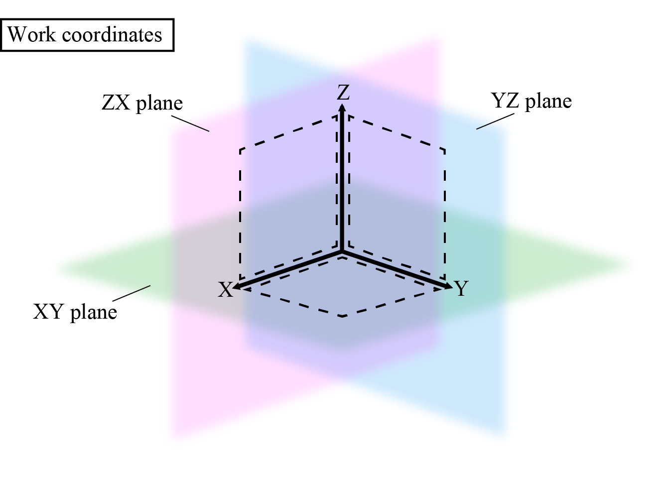 - With the three axes (X, Y, and Z axis) on the current Work coordinate system, assume that a plane that consists of two of these axes is called a Plane A. The actual rotary surface is a plane which contains the current position and is horizontal to the Plane A.