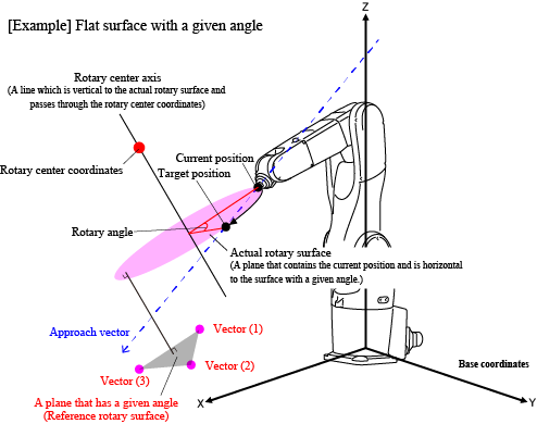 - On the base coordinate system, specify three points by Vector type data. Assume that a plane that consists of the three points is called a Plane A. The actual rotary surface is a plane which contains the current position and is horizontal to the Plane A.