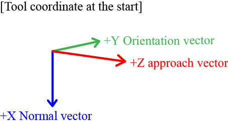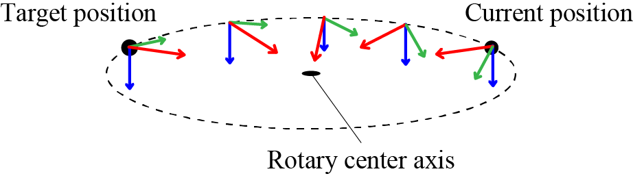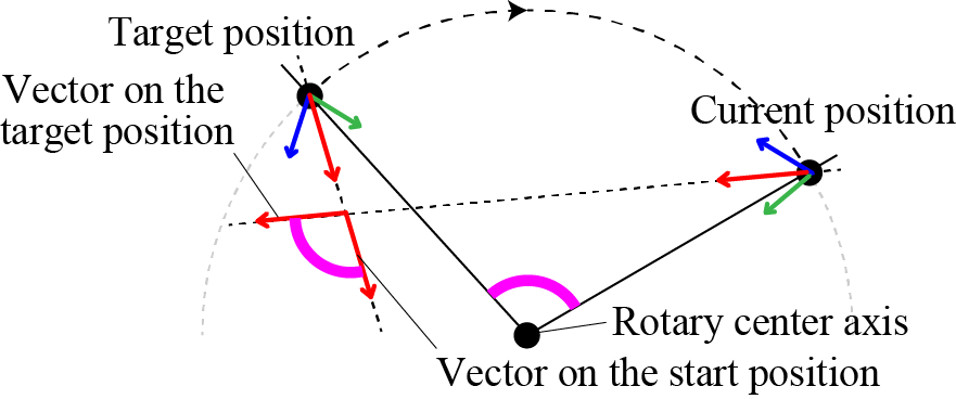 If the approach vector on the current position is horizontal to the actual rotary surface, it is impossible to determine the rotation direction. As a result, a robot may move in different direction even if the same motion is performed. In that case, change the current position and/or the condition of the actual rotary surface, or enable static. When "static = [Enable]" is specified, the vector direction of the rotary center axis is determined regardless of the direction of the approach vector. For details, refer to the following explanation.