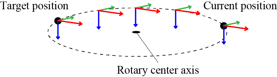 Rotary option specifies whether or not the posture is maintained according to the rotation. When "Pose = 1" is specified, the posture changes along with rotation. When "Pose = 2" is specified, the posture at the current position (start point) is maintained and rotation motion is performed for the track only.