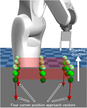 For example, when the four corner position approach vectors face in the vertically downward direction to the XY plane of the base coordinates, the height of one stack increases in the vertically upward direction from the XY plane (Example 1).