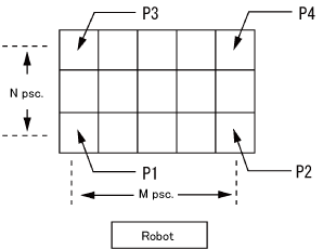 Pallet.CalcPos(P1_P3 divisions,P1_P2 divisions,Height of one stack,pallet 4-corner position P1,pallet 4-corner position P2,pallet 4-corner position P3,pallet 4-corner position P4,pallet target position number[, Stack count])
