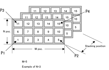 Pallet conditions to specify are; P1-P3 division (N), P1-P2 division (M), stack height, and pallet four corners (P1 to P4).