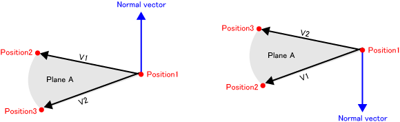 Return a vector which is vertical to a plane where three points belong (normal vector). The direction of the normal vector is the same as the cross product of V1 and V2. See the figure above.