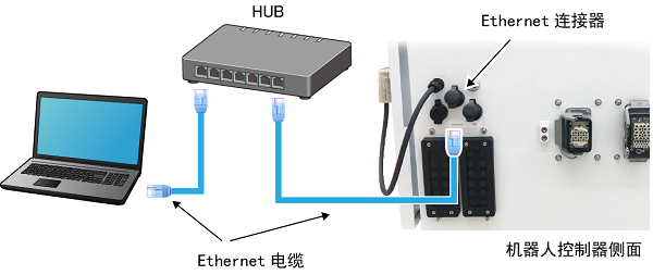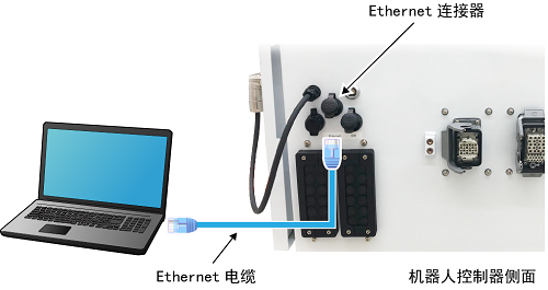 通过Ethernet电缆连接计算机和机器人控制器。