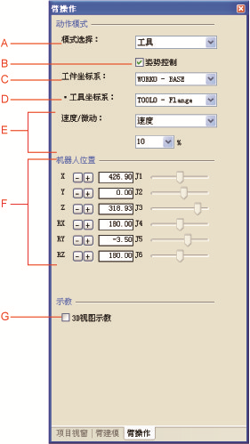 在各轴上操作显示在“机械臂3D视图”上的机器人的机械臂。