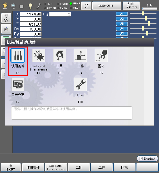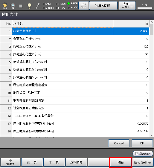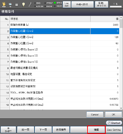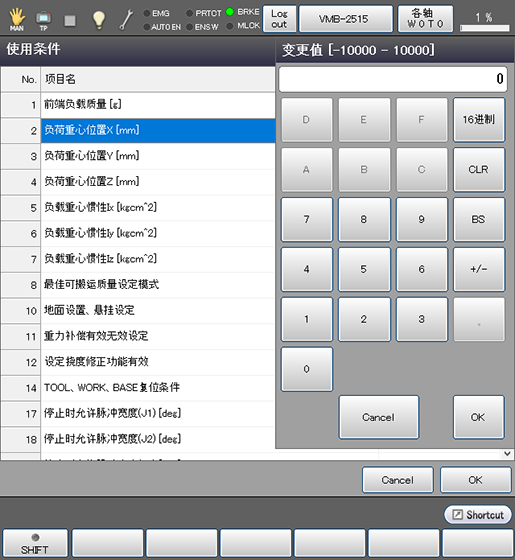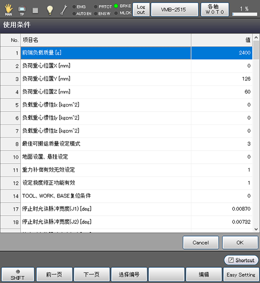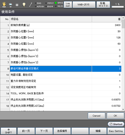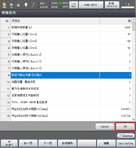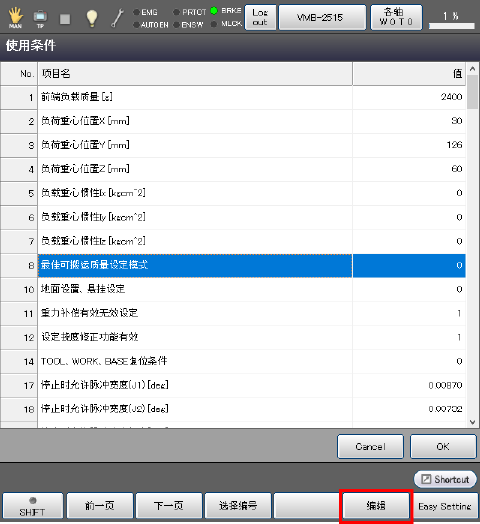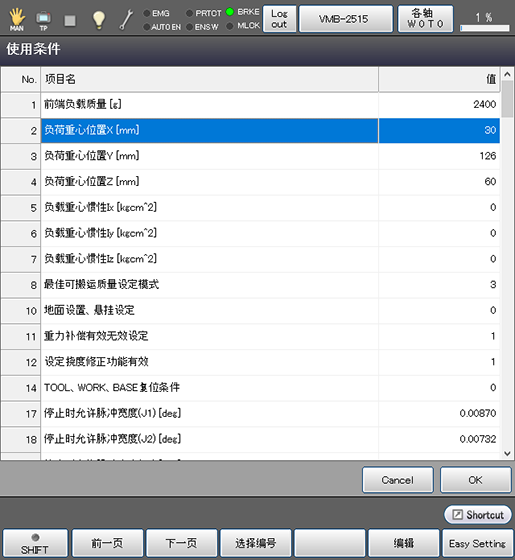 关于机器人的运行条件,如果掌握了负荷质量(工具和其前端的负荷的合计质量)以及其重心,请按照下述步骤进行设定。