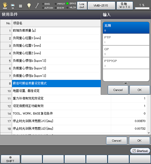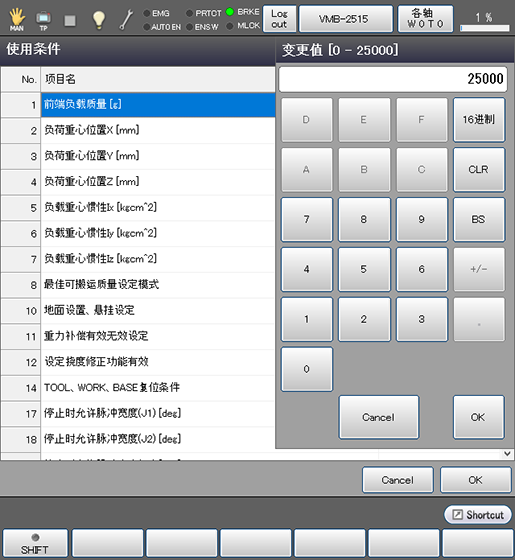 可以设定运行机器人所需的基本参数的机器人手臂前端的“负荷质量”(使用工具时,为其工具和前端负荷的合计质量)、“负荷重心”、以及以最佳速度、加速度控制这些负荷条件所对应的机器人所需的“最佳速度控制功能”。