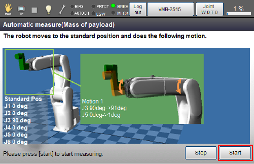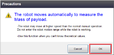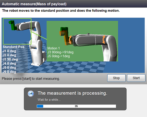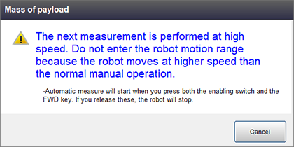 负载推断画面中将显示机器人的动作方式,以及测量时的注意事项。