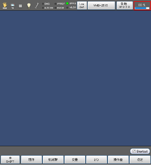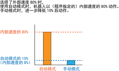 - 在自动模式下,实际的机器人以[内部速度×外部速度(%)]动作。例如,将外部速度设定为80%,则机器人以内部速度×80%的速度运行。