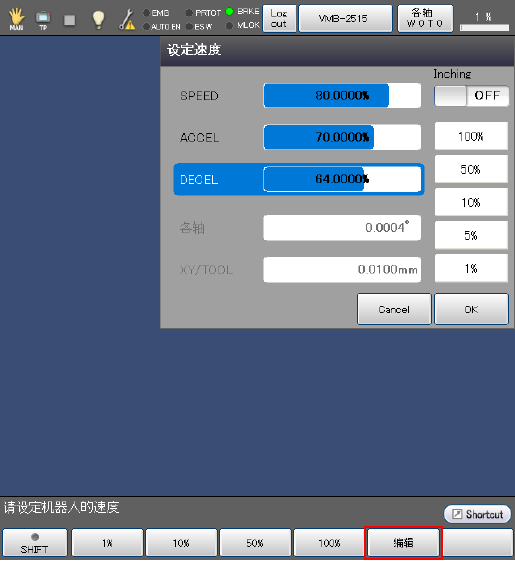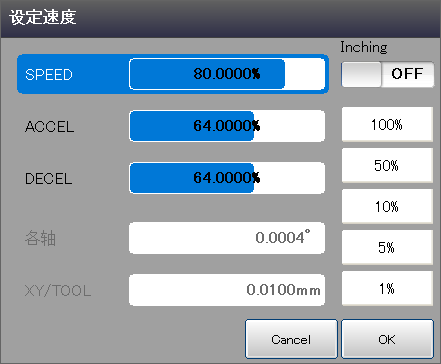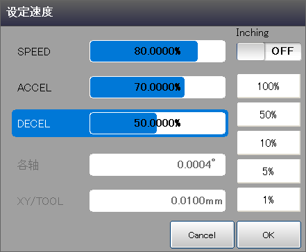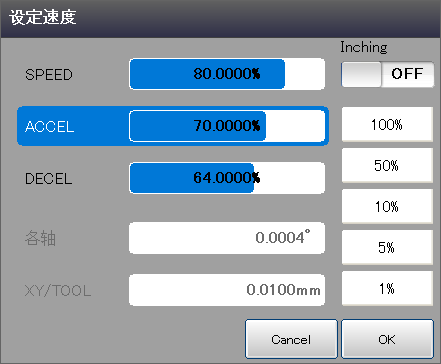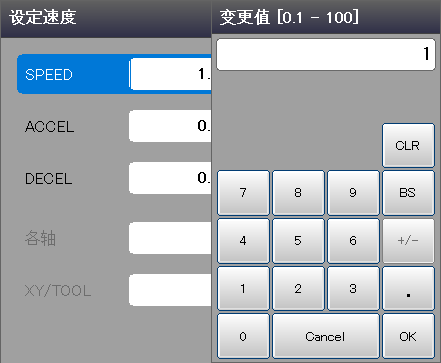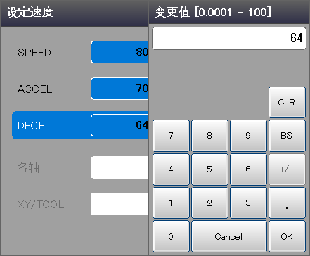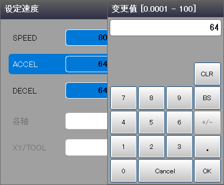 数字键消失,如下所示,加速度被新输入的数值更新。要取消更新,请按压[Cancel]。画面返回至原画面。另外,此处如果按压[Cancel],则之前设定的外部速度也返回至更新前的状态。