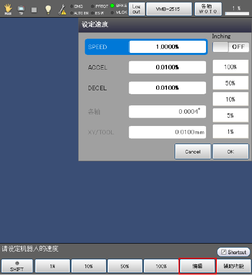 外部速度是指为了教导及试运行等,通过智能TP设定的速度,其单位以相对最高速度(内部速度)的百分比(%)来表示。