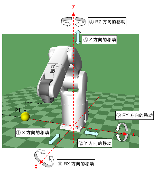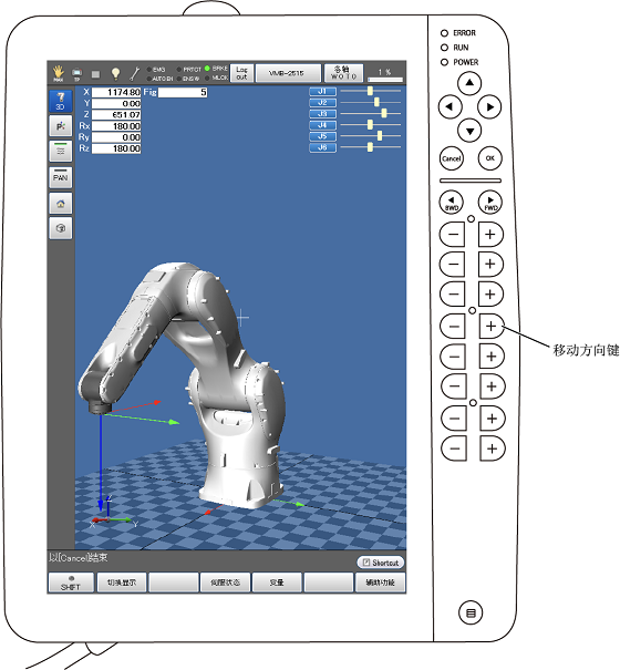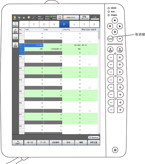 按压允许开关的同时,适当按压移动方向键,将机器人移动至要在P1中设定的位置。