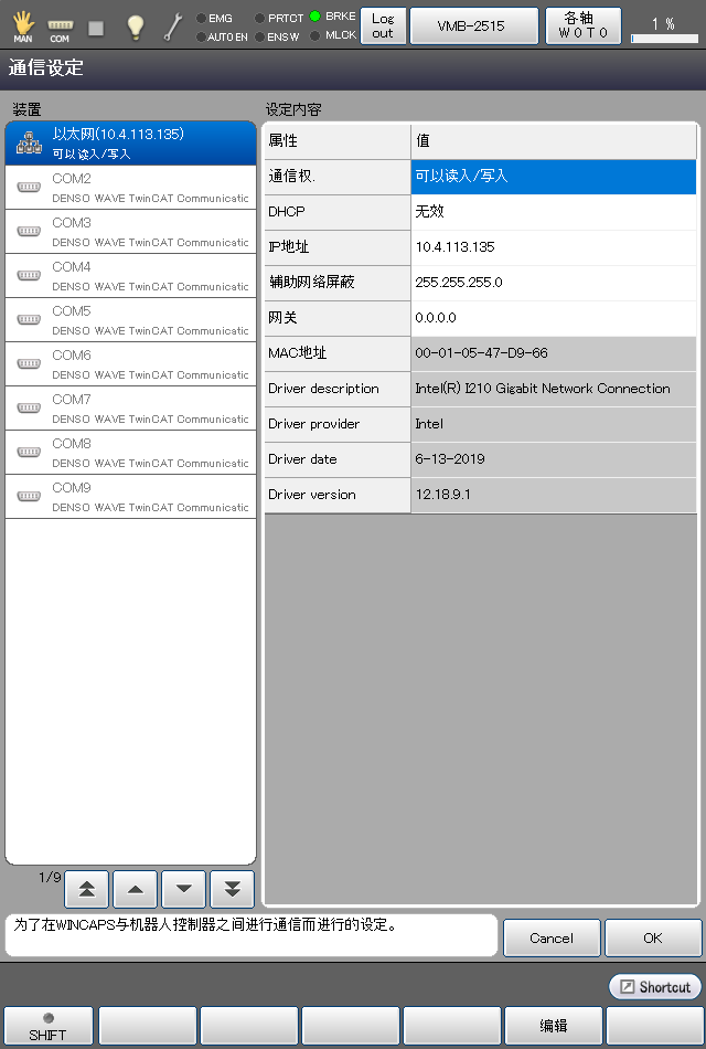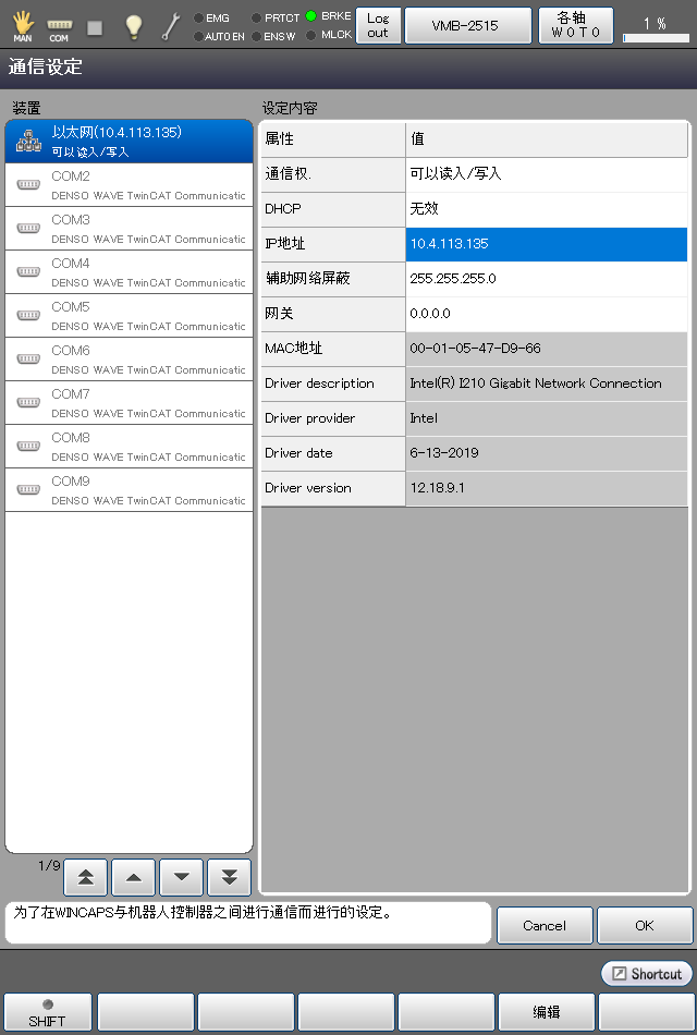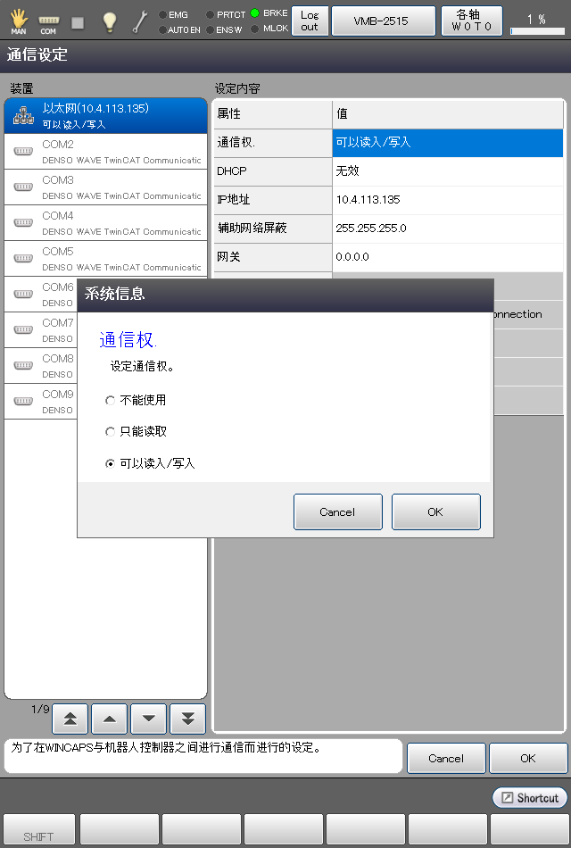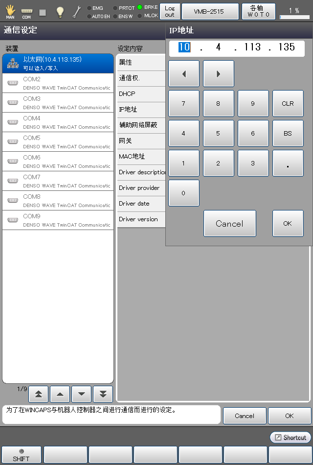 设定机器人控制器,以便可以通过以太网进行计算机(WINCAPSIII)和机器人控制器通信。该设定在智能TP进行。