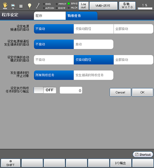 进行运行模式切换为自动模式时的特权任务程序的启动设定。 从[不启动]、[仅启动路径]、[全部启动]中选择设定。 |
