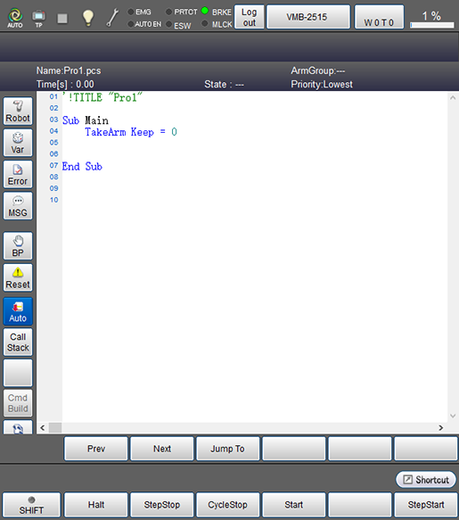 | Auto | 将自动滚动条设为ON/OFF。ON状态下,按钮的蓝色灯亮起。 通常自动滚动条为ON。在ON状态下,执行程序时,编辑器的光标追踪至执行行并在画面上显示执行行。可在画面上确认执行至何处。 设定为OFF的状态下,执行程序时,可在显示文件内自由移动编辑器的光标。可显示需要确认的行。