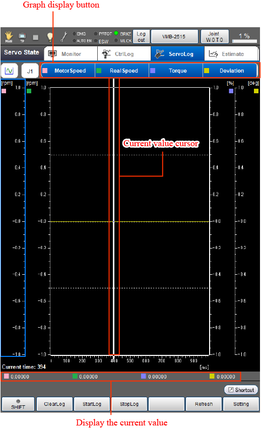 如果按压按钮,则显示下拉菜单。 按压并选中要显示伺服Log的轴编号。 可显示J1~J8的各轴数据。 |