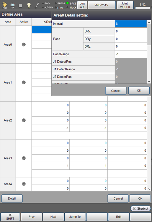 操作路径:[F2 机械臂]-[F6 辅助功能]-[F5 区域]-[F7 详细]