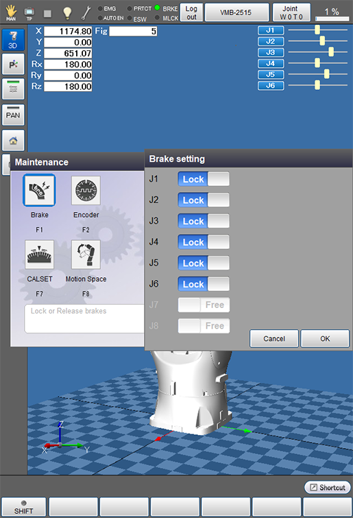 操作路径:[F2 机械臂]-[F12 维护]-[F1 制动器]