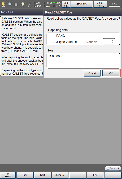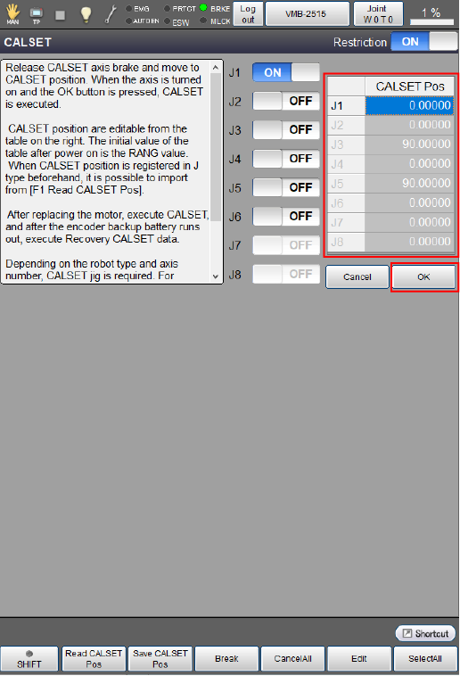 按画面的[OK]按钮,使用画面右侧显示的CALSET位置执行CALSET。