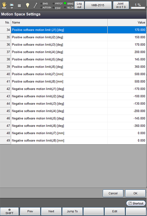 操作路径:[F2 机械臂] - [F12 维护] - [F8 动作范围]