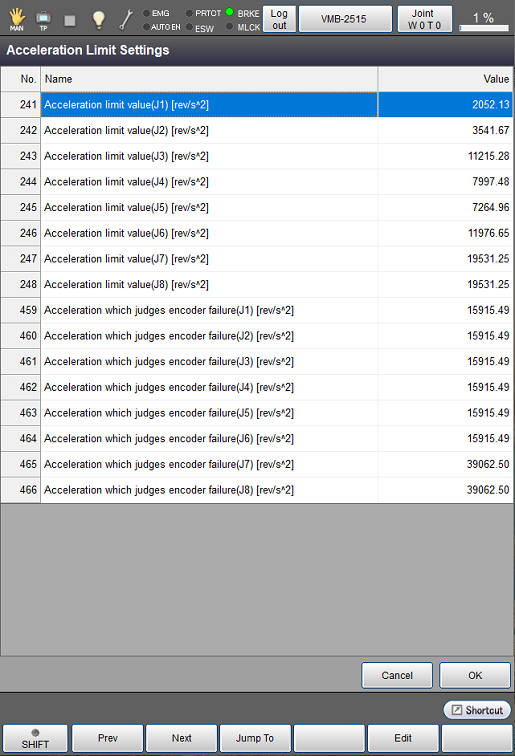 操作路径:[F2 机械臂] - [F12 保养] - [F12 服务功能] - [F1 最大加速度]