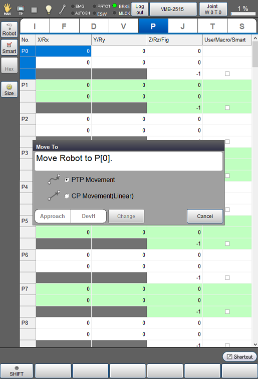 在机器人向目标坐标值移动中,可以选择用[PTP动作]移动或用[CP动作(直线)]来移动。