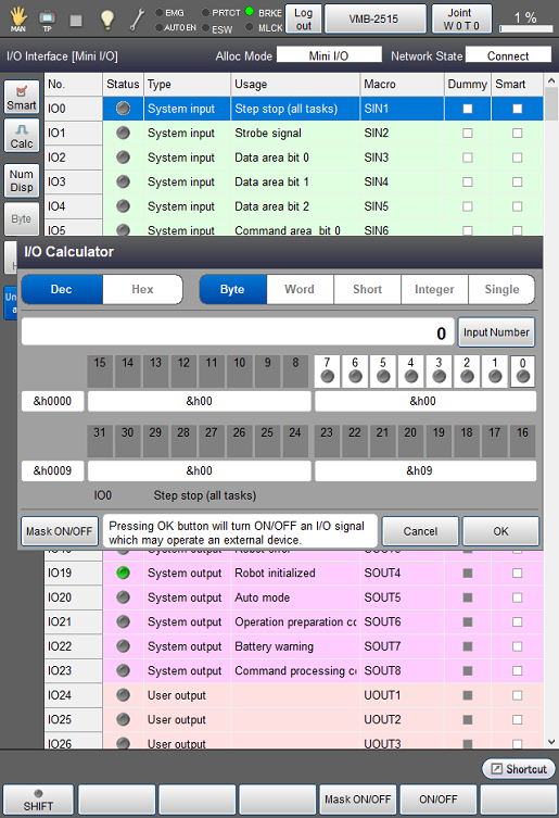 | [数值输入] | 显示数字键。 如果使用数字键输入比特计算值后按压[OK],则输入值相应的比特会变为ON。 |