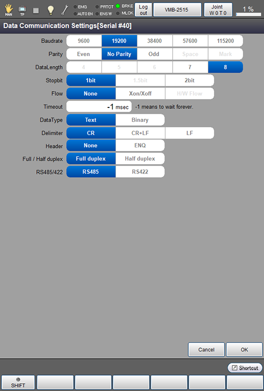 | 间隔符 | 指定文本类型时,指定通信用文本的分隔符。 选择“CR“(0x0D)、“CR+LF“(0x0D 0x0A)或者“LF”(0x0A)。 |