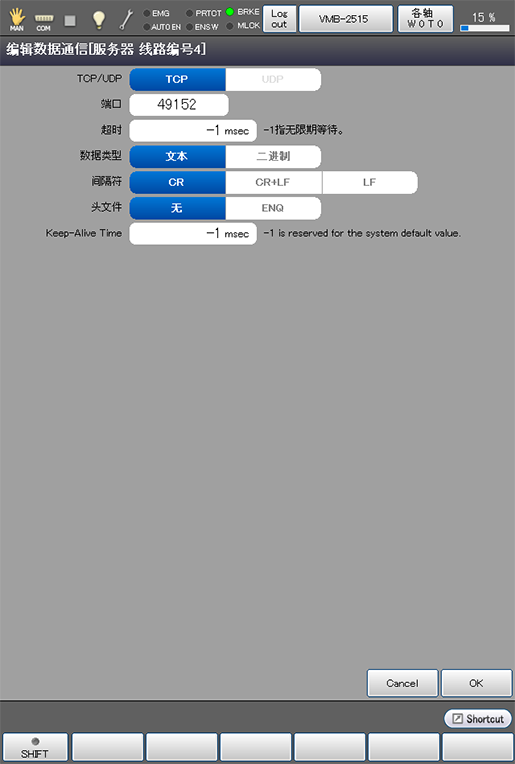| TCP/UDP | 指定通信协议。选择TCP或者UDP之一。 TCP可发送接收,UDP是发送专用功能(控制器 -> 外部机器)。 |
