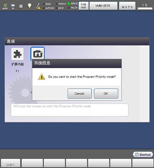 在程序优先模式中可使用的按钮有紧急停止、Cancel键、画面上的[Cancel]按钮、[MOTOR]、[MLock]。