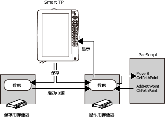 通过PacScript的指令参照的数据为操作用存储器内的数据。不能直接参照保存用存储器的数据。