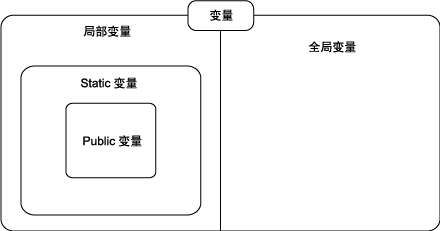 | 变量的名称 | 局部变量 | Static变量 | Public变量 | 全局变量 | ||