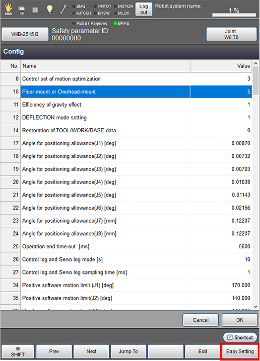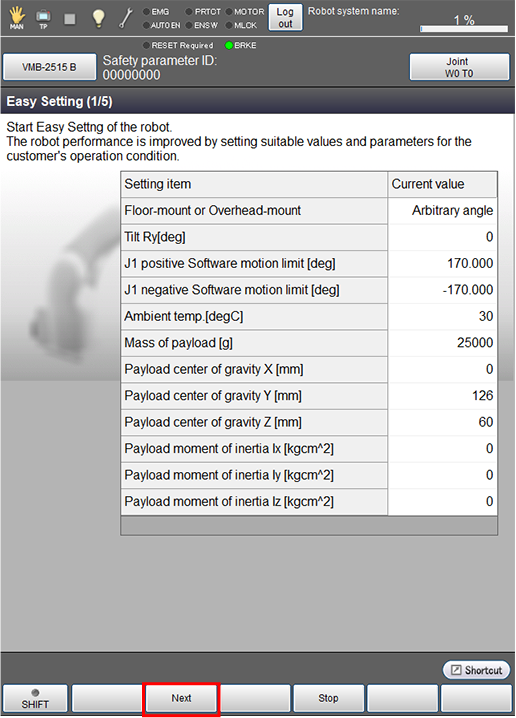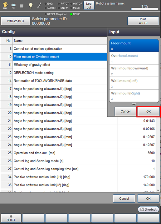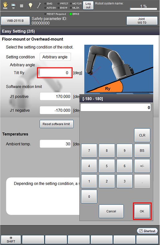根据[倾斜角度Ry[deg]]不同,需要限制机器人的第1轴运行范围。限制时会显示如下信息,请按下[OK]。