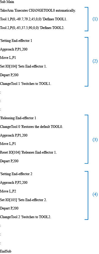 In the sample program, End-effector 1 and End-effector 2 are defined as TOOL1 and TOOL2, respectively.