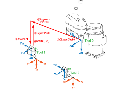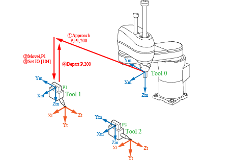 As illustrated in the figure below, End-effector 1 will be mounted by "Set IO [104]." "Depart P,200" will make the robot apart from P1 and CHANGETOOL 1 switches the tool coordinates from TOOL0 to TOOL1.