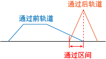 通过后轨道变短,速度模式变成三角模式时,通过起始位置将延迟,在通过后的轨道的加速结束时完成通过动作。因此,如下图所示,通过前轨道的减速度较小时,通过效果明显变小。