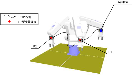 通过PTP控制按顺序使机械臂从当前位置动作至P1、P2。