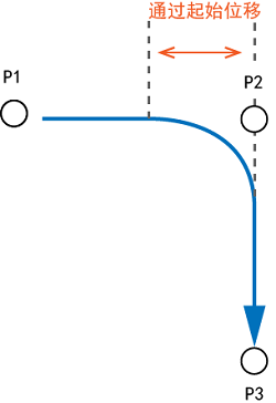 “通过起始位移”的数值为以指定坐标(姿势)为中心的球的半径,如果动作指令值进入其中,移至下一控制。以mm为单位指定。即,表示动作点的“停止方法”。从一个动作移至下一个动作时,包含以下内容。
