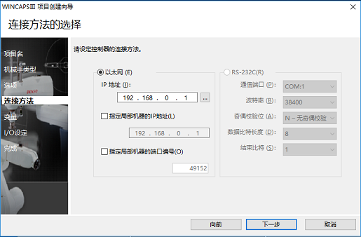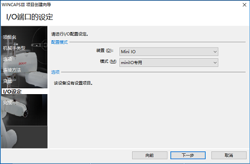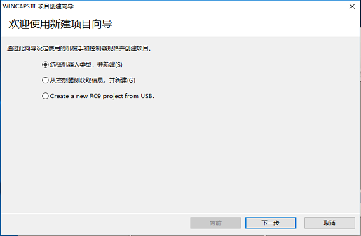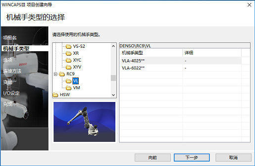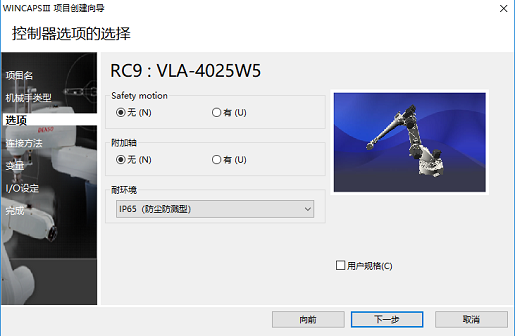 选择所用机器人控制器以及机械手类型后,单击[下一步]。