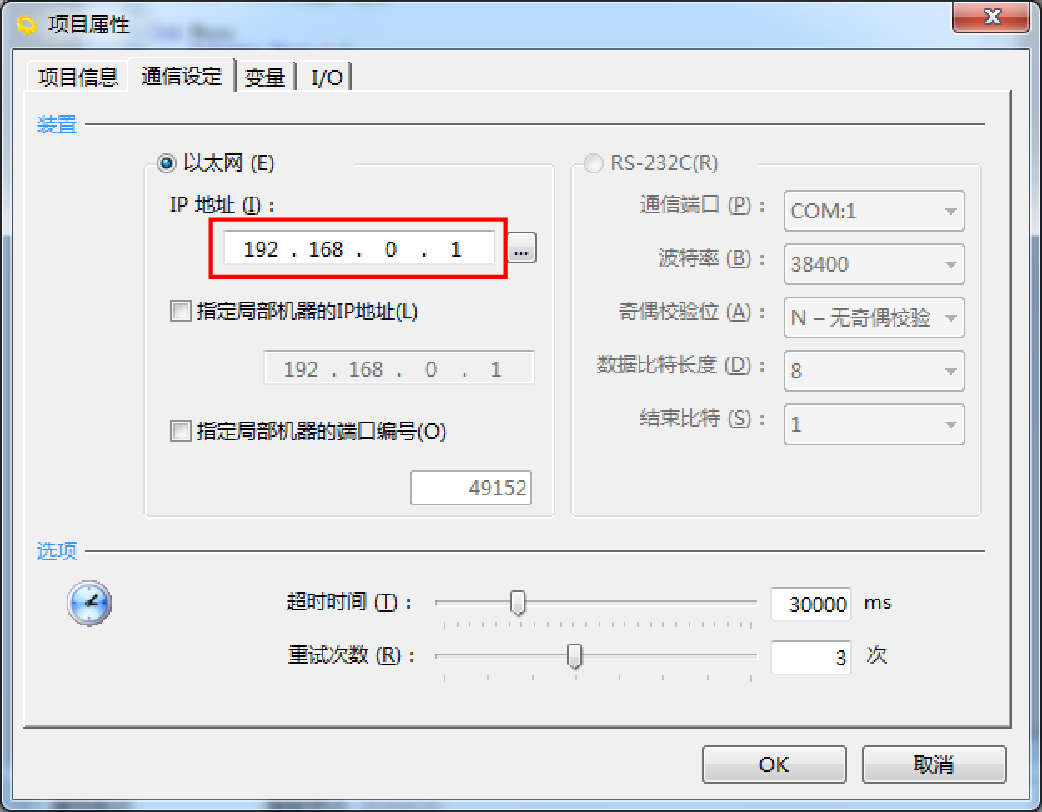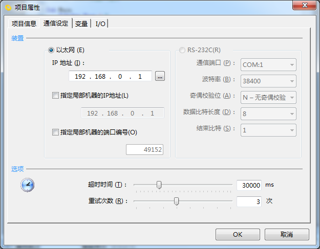 项目的通信设定在项目创建向导时进行,但创建后,选择[项目(P)]-[属性(R)]-[通信设定]选项卡也可显示、设定。