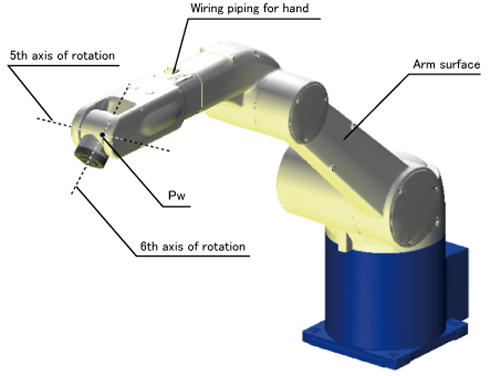 使用第5轴的旋转轴和第6轴的旋转轴交叉点“Pw”的位置进行臂、肘、手腕的边界的判断。