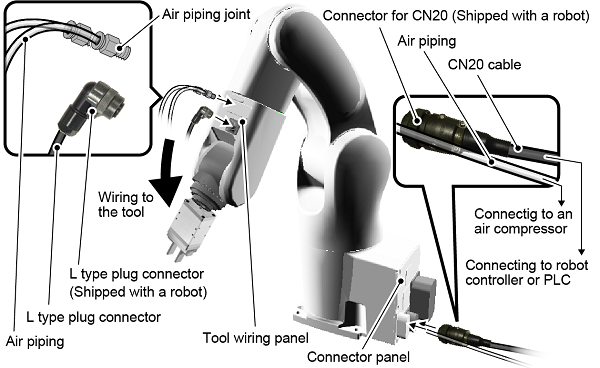 如下图所示,信号线·气动配管电磁阀规格可以将信号线、气动配管从工具配线面板配线·配管到工具。连接至连接器面板的信号线及气动配管通过机器人内部,直接连接到工具配线面板。因此,从工具配线面板开始,无需在连接器面板间进行配线·配管。